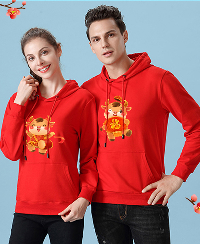 • YDWY201212男女同款2021生肖牛年加絨連帽新年紅色衛(wèi)衣定制本命年元旦公司年會(huì)印logo